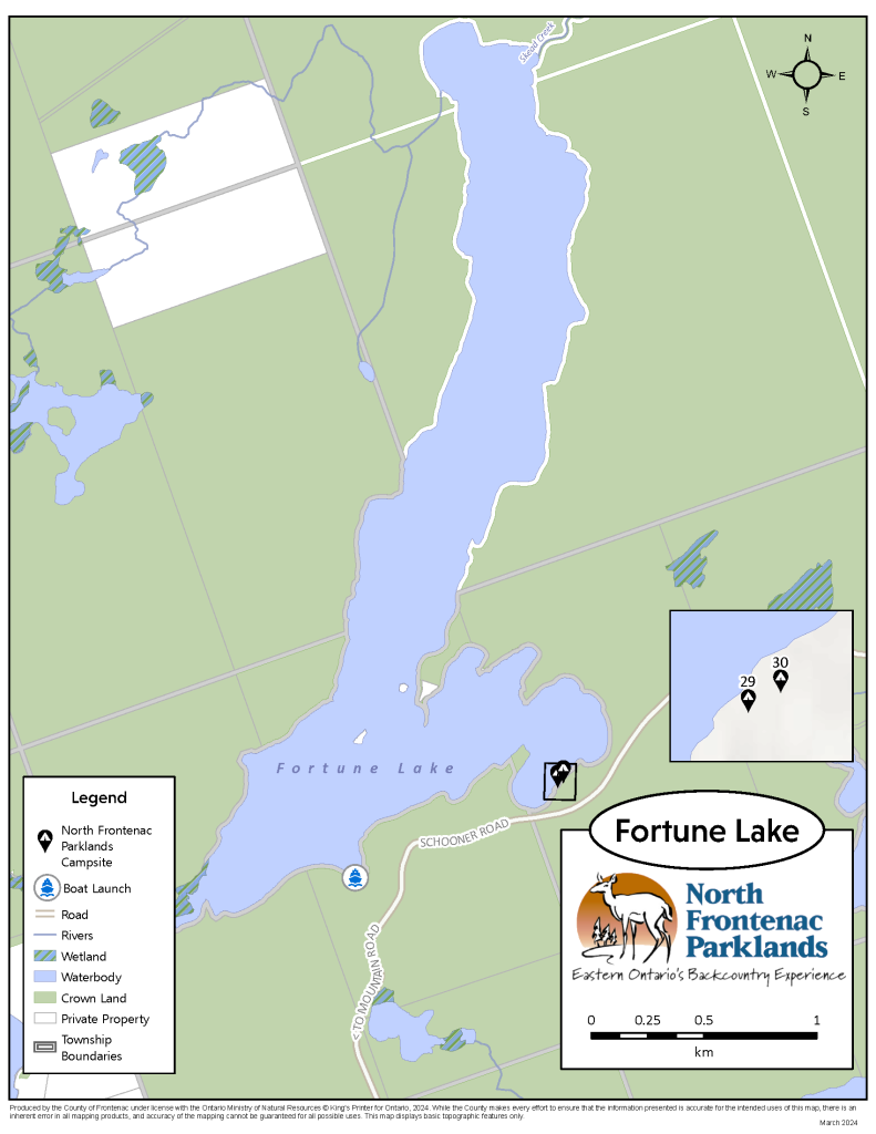 Access is via Mountain and Schooner Lake Roads from Plevna. Head north on the Mountain Road off of Road 509 at Plevna (right beside the Lookout Home Hardware). At the “T” intersection turn left to stay on Mountain Rd. At the junction with Brule Lake Rd (at the north end of Shaw Lake) stay to the right to remain on Mountain Rd. Turn left onto Schooner Lake Rd and follow the signs. Schooner Lake Rd is part of North Frontenac Parklands. The two Fortune Lake campsites are just off the Schooner Lake Rd on the left at the sign.